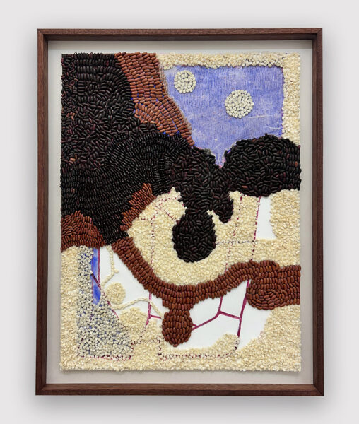 Fabiana Ex Souza Oiseaux de nuit 2025-Pink lingot beans red beans white corn plant-resin and drawing on cardboard 80x60cm.-Courtesy of the Artist and AFIKARIS
