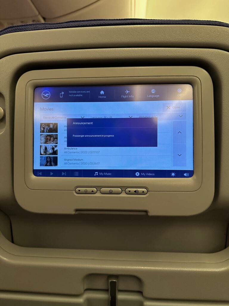 Pour ce qui est du divertissement, il était devenu aléatoire sur notre vol. C’était un peu la loterie, tout dépendait du numéro de votre siège. Sur le mien, seuls 7 films étaient disponibles, mon voisin en avait 28, celui de la rangée à ma gauche en avait 52. Le chanceux ! Enfin, l’homme d’affaires devant moi n’en avait que cinq. Ce n’était décidément pas son jour… Le pauvre ! Lorsque je suis allé parler poliment à la cheffe de Cabine pour lui demander si le problème technique allait être réglé, elle me répond sur un ton hautain, probablement énervée par toutes ces failles techniques. J’ai dû lui rappeler qu’on avait tous payé assez cher pour voyager en classe Madras et qu’il était normal qu’on s’attende à un service de divertissement conséquent. Plus tard, constatant sa mauvaise humeur et que le programme sur mon écran était toujours réduit en choix, je lui ai signalé que j’étais blogueur et que j’allais écrire un petit article. A partir de cet instant, la magie se produit. Le sourire, l’humour et les petits gestes attentionnés étaient présents pendant tout le reste du vol. Elle me prévint à l’avance qu’il n’y aurait pas de café car leur machine Nespresso ne fonctionnait pas et qu’elle ne pouvait rien faire malheureusement pour les écrans de peur que le système de divertissement ne redémarre plus pour tout l’avion.