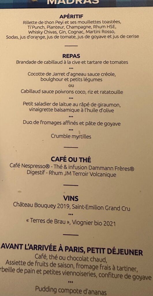 La classe Madras chez Air Caraïbes était dans l’ensemble décevante, sauf pour le repas. Il est vrai qu’on ne peut juger une compagnie aérienne sur un seul vol car il suffit en fait de la bonne ou mauvaise humeur d’un seul agent de bord pour que votre vol devienne une expérience plaisante ou désagréable.
